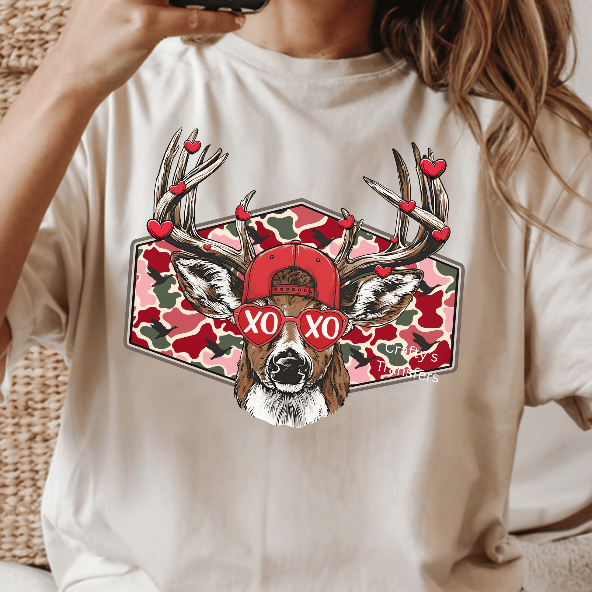 Add western charm and Valentine flair to your apparel lineup with this adorable XOXO Deer DTF transfer. Featuring a stylish deer wearing heart-shaped XO sunglasses, a red cap, and floating heart accents over a trendy camo background, this design blends country style, cute humor, and Valentine vibes perfectly.